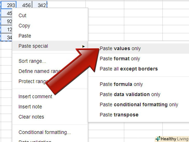 - Виберіть " Спеціальна вставка "і потім"вставити тільки значення". Комірки будуть перезаписані реальними значеннями замість формул.