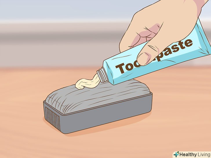 Нанесіть на губку зубну пасту. делікатне, але при цьому абразивний засіб очищення (таке як зубна паста) відмінно підходить для очищення губок-стирачів. Видавіть смужку зубної пасти на очищувальну поверхню кожної губки, яку вам потрібно вимити. [7]