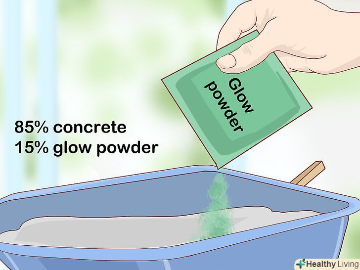 Додайте в цемент люмінесцентний порошок. люмінесцентний порошок-це речовина, яка поглинає енергію сонця протягом дня. Спеціальні порошки для змішування з цементом можна знайти в місцевому будівельному магазині. Хоча пропорції можуть відрізнятися, більшість виробників рекомендують використовувати суміш, на 85% складається з цементу і на 15% ‒ з люмінесцентного порошку. [5]- Наприклад, щоб отримати 38 кг суміші, потрібно змішати 32 кг цементу і 5,7 кг люмінесцентного порошку.