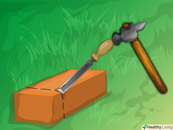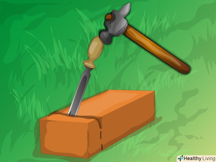 Покладіть цеглу на землю або в пісок. встановіть долото під кутом близько 60 градусів на раніше нанесену лінію розрізу. Злегка вдарте по долоту молотком-кирочкой.