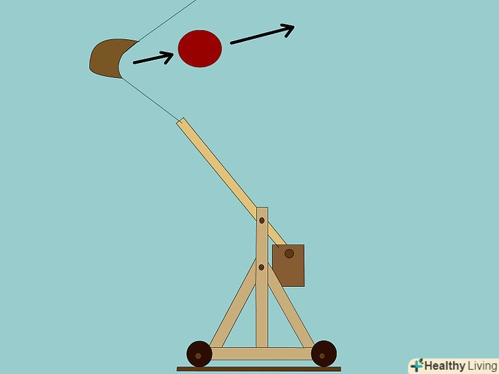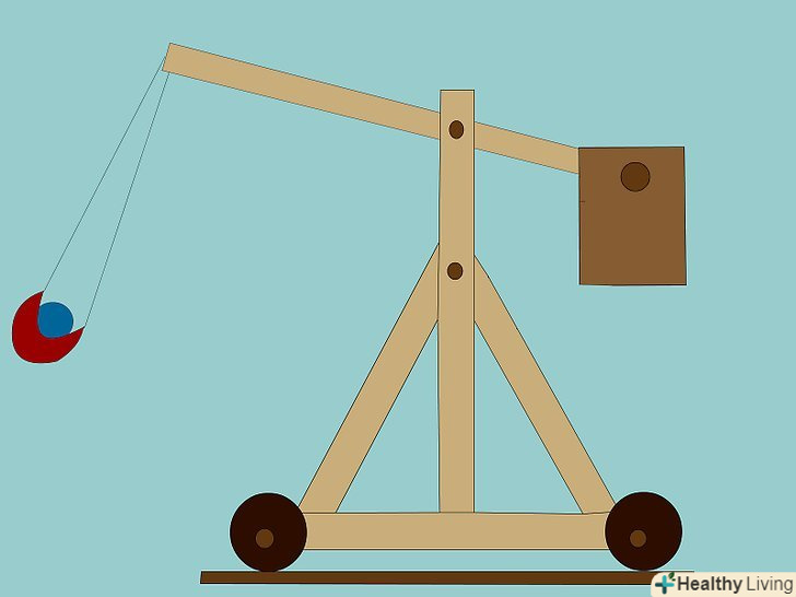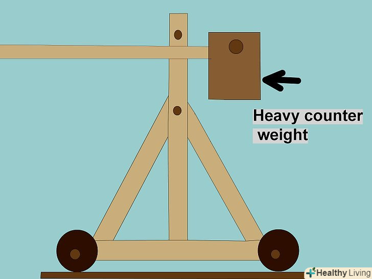 - Поставивши підставу катапульти на колеса, ви не тільки зможете її легко переміщати, але і збільшите пускову силу, оскільки при падінні противагу буде тягнути всю конструкцію вперед, додаючи ще більше прискорення важелю. Це схоже на те, як в бейсболі пітчер надає більше прискорення м'ячу, піднімаючи одну ногу, а потім опускаючи її в момент кидка м'яча і нахиляючись трохи вперед.