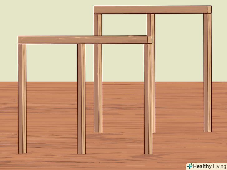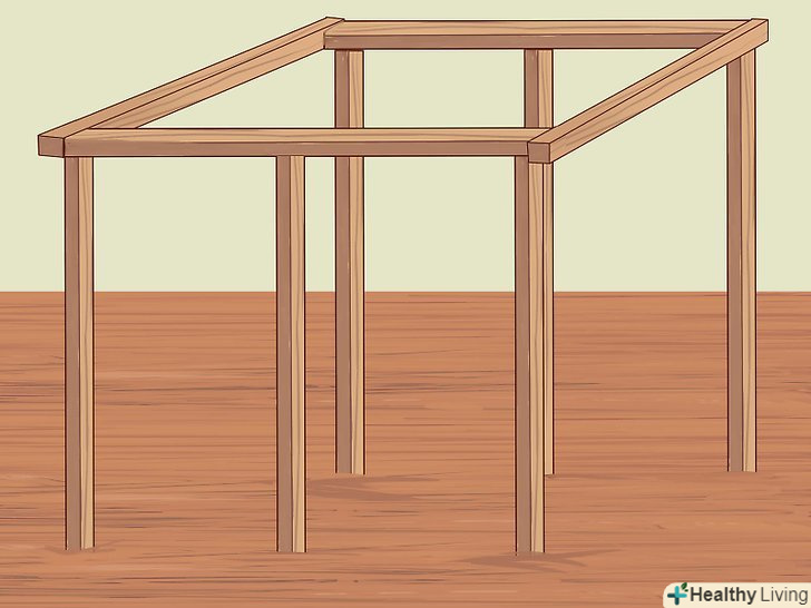 В першу чергу, прибийте передню і задню поперечину. для більшої міцності стін навісу необхідно побудувати звичайну прямокутну коробку приблизно 4.9 м в довжину, 2.7 м в ширину і 2.1 м у висоту, прибивши поперечини до підпорів. [4]- Зміцніть дві підтримують перехресні поперечини поверх коротших кутових підпірок строго горизонтально і простягніть їх до більш високих кутових підпірок на 60 см нижче верхнього краю. Потім прибийте їх до більш високих підпорів за допомогою Т-образних гачків, які можна купити в будь-якому будівельному магазині. Перш ніж прибивати поперечини до Т-образним гачкам, переконайтеся в тому, що вони розташовані рівно.