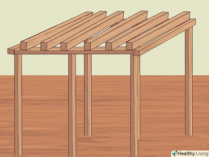 Прикріпіть кроквяні балки до бічних поперечин. шість кроквяних балок розміром 5 см х 10 см х 3 м для підтримки даху необхідно прикріпити до основної дерев'яній коробці одним з двох способів: за допомогою гачків і за допомогою прорізів. У будь-якому випадку передню і задню кроквяну балку необхідно прикріпити до передньої і задньої перекладині. Решта чотири балки потрібно розташувати на рівній відстані один від одного уздовж перекладин довжиною 4.9 м кожні 0.9-1.2 м. [5]- ПриКріпленні кроквяних балок шляхом підпилювання вони будуть розташовуватися по кутах перекладин. Для цього покладіть передню кроквяну балку на поперечину і відзначте олівцем місце з'єднання балки з однієї зі сторін поперечини. На цьому етапі необхідно підпиляти балку циркулярною пилкою, щоб в остаточному варіанті балка йшла на 3.3 см в поперечину. Як тільки ви досягнете потрібного результату, зніміть кроквяну балку і використовуйте її як приклад при підготовці РЕШТИ п'яти балок. Під час кріплення балок вбивайте цвяхи під кутом, щоб вони проходили через одну зі сторін балки і входили в нижню поперечину.