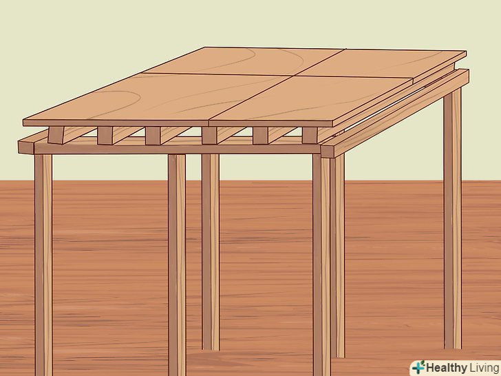 Прикріпіть фанерні дошки до кроквяних балок. покладіть фанерні дошки таким чином, щоб вони виходили за межі перекладин на 15 см з передньої і задньої частини навісу. В цьому випадку навіс буде мати цілісний вигляд.- Купуйте найбільші фанерні дошки. Параметри фанерної дошки зазвичай 1.2 х 1.8 м, але розміри можуть відрізнятися. Вся поверхня даху дорівнює 1 х 5.2 м.відріжте шматок фанери циркулярною пилкою, щоб швів було якомога менше. Чим менше швів, тим менше ймовірність протікання