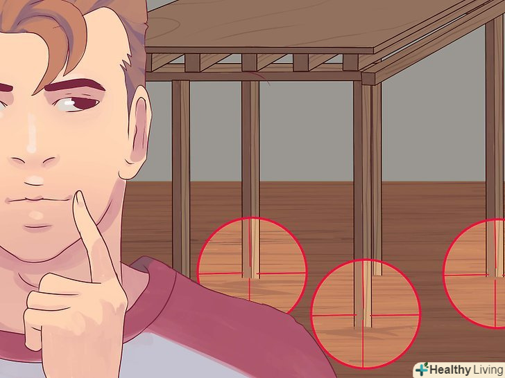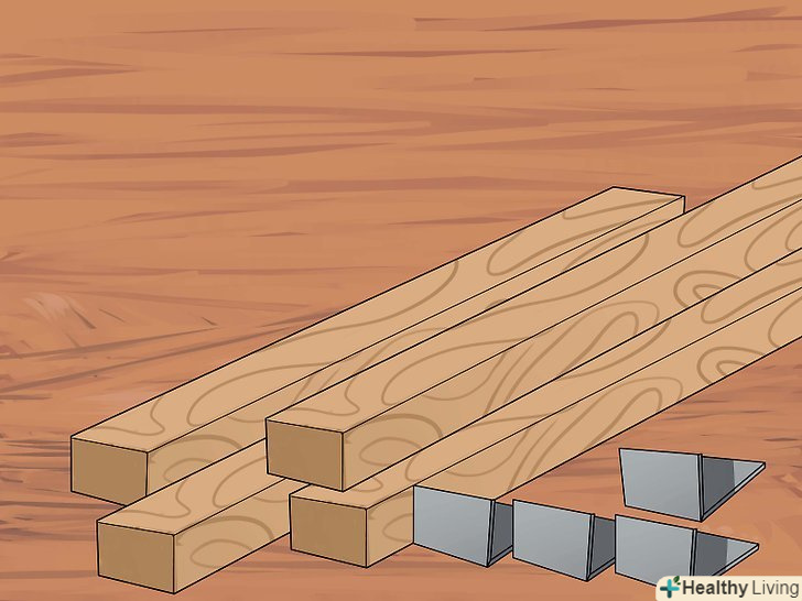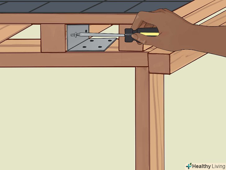 Закріпіть місця з'єднання металевими пластинами. для більшої стійкості в місцях з'єднання елементів конструкції можна використовувати металеві пластини. У будівельних магазинах можна знайти різноманітні металеві пластини, які можна прибити до місць з'єднання елементів конструкції, особливо між підпорами і перекладинами, перекладинами і кроквяними балками і так далі.