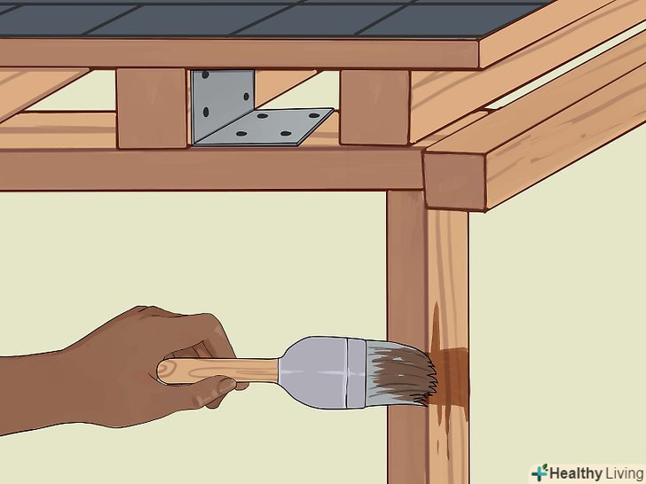 Пофарбуйте дерев'яні елементи конструкції. на кінцевому етапі роботи можна пофарбувати дерево захисним шаром фарби. Це збільшить довговічність дерева і позбавить вас від необхідності будувати навіс заново через кілька років.- Можна також регулярно перефарбовувати дерево, щоб збільшити довговічність конструкції. Час від часу повертайтеся до роботи над навісом, якщо що-небудь потребує ремонту, щоб уникнути більш серйозних проблем.