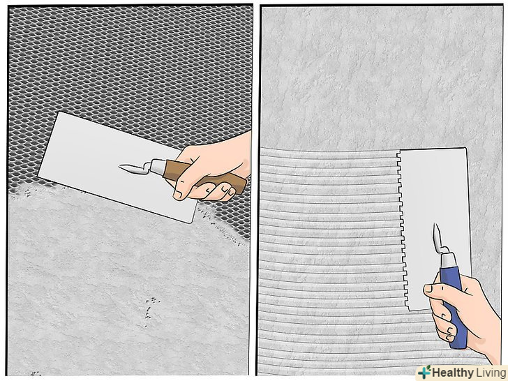 - Наносите обризг горизонтально 1,27-сантиметрової зубчастої кельмою, коли штукатурка зміцніє, але все ще не буде сухою. [2] такий спосіб нанесення дає цьому шару його відмітна назва і дозволяє міцно утримувати наступний шар штукатурки.