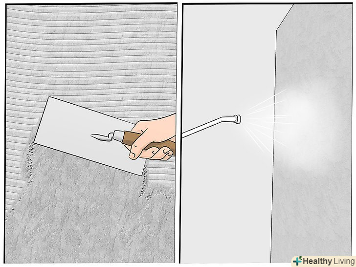 Промийте поверхню сумішшю домашнього миючого засобу та теплої води. нанесіть миючий засіб губкою на внутрішні стіни або розпилювачем - на зовнішні. Ретельно змийте теплою водою і дайте поверхні повністю висохнути.- Штукатурка не буде прилипати до стін, якщо на них є пил та інші забруднення. Ретельно очистіть їх, щоб клейовий склад краще кріпився до вашої стіни.