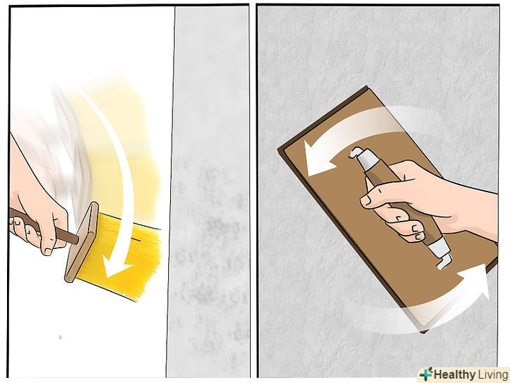 Нанесіть оздоблювальне покриття, текстуру або зробіть "затірку" на ваш розсуд. фінішний шар штукатурки повинен бути досить тонким, близько 3 см завтовшки. Тут при необхідності ви будете змішувати текстуру нової штукатурки зі старою, або можете створити абсолютно нову текстуру, якщо ви починаєте з нуля. У вас є кілька варіантів нанесення фінішного шару:- Додайте в обробне покриття трохи більше води, щоб зробити його рідким. Потім використовуйте широку кисть, щоб розпилити або розбризкати водянисте завершальне покриття на попередній шар. Це називається накривочним шаром штукатурки.
