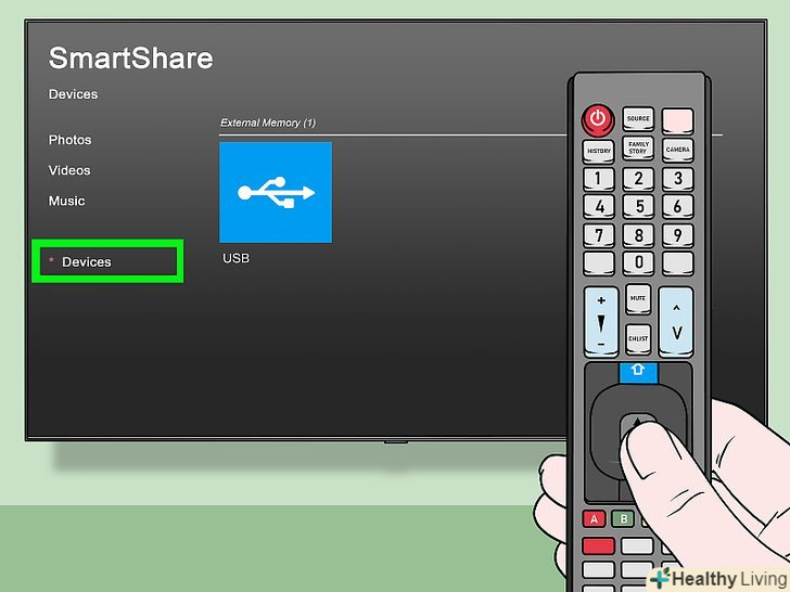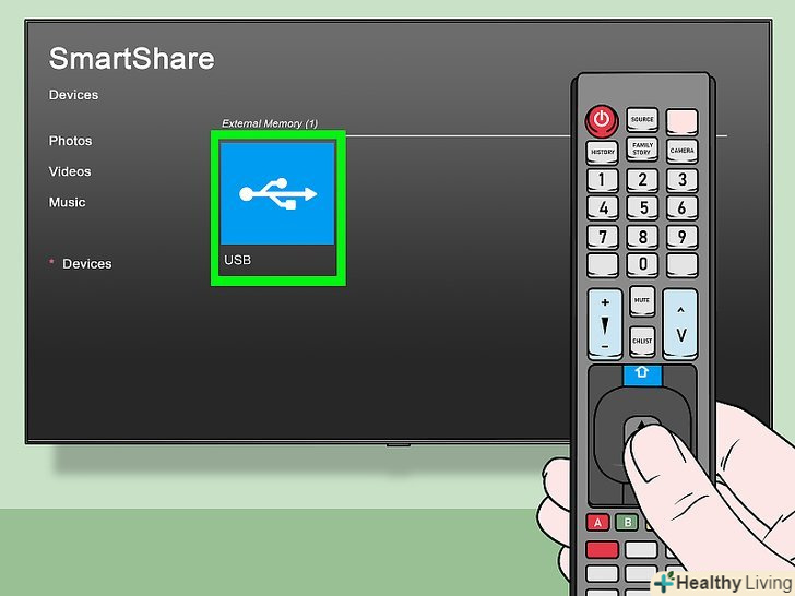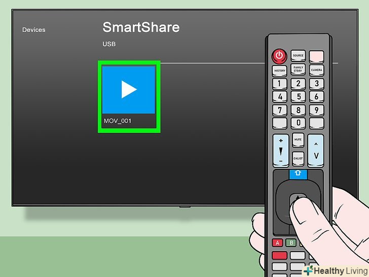 Виберіть файл, який хочете відкрити на екрані телевізора.відкривши сторінку свого комп'ютера, виберіть файл з відеороликом, фотографією або музикою.[3]- Комп'ютер, з якого ви збираєтеся транслювати контент, повинен бути включений і на ньому потрібно авторизуватися в своєму обліковому записі, щоб файли, що зберігаються на комп'ютері, відобразилися на екрані телевізора.