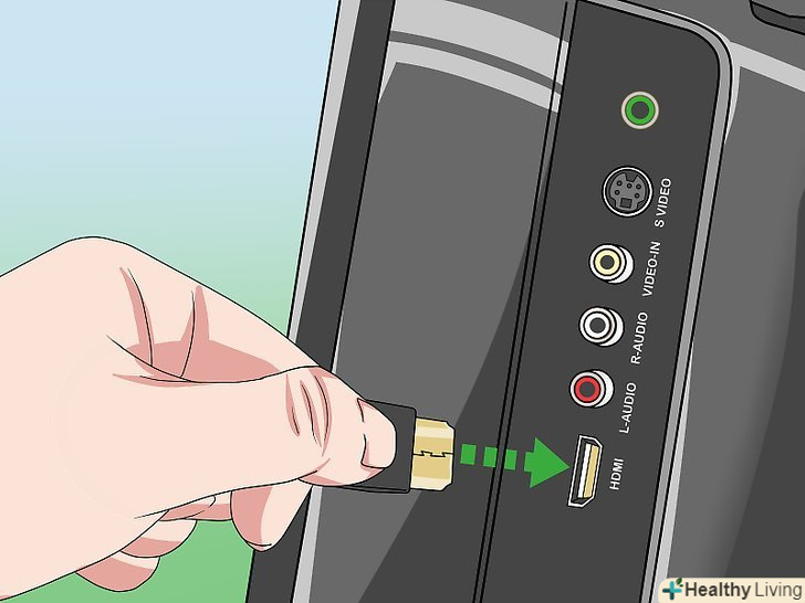 Підключіть один кінець HDMI-кабелю до телевізора.вставте HDMI-кабель в HDMI-роз'єм на задній або бічній панелі телевізора.- Якщо на телевізорі кілька HDMI-портів, вони будуть пронумеровані. Запам'ятайте номер роз'єму, щоб налаштувати телевізор на правильний сигнал.