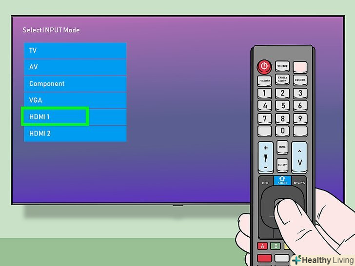 Перейдіть на сигнал з HDMI-порту.скористайтеся кнопкою «Input» (вхідний сигнал) на пульті телевізора, щоб налаштуватися на сигнал з HDMI-роз'єму, до якого підключений комп'ютер. На екрані телевізора відобразиться картинка з комп'ютера.