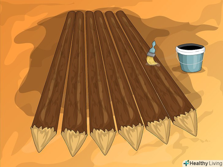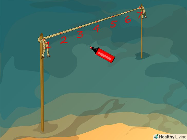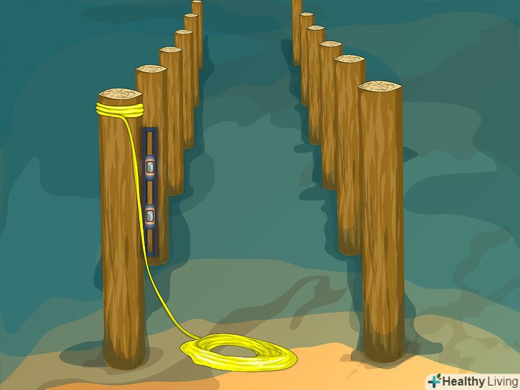Вимостіть місця під палі дерев'яними брусками 2х4 дюйма (5х10см), вставленими в грунт біля берега, а інші розташуйте на дні заплави за межами розташування останньої палі. Зв'яжіть будівельною стрічкою обидві розмічальні палі (на березі і в воді), виміряйте відстань від бруска до бруска, розмітьте стрічку спиртовим маркером. Стрічка повинна висіти над водою на висоті верхівок паль, які будуть встановлені. Встановіть пластиковий кутник з кутом в 45 градусів і обріжте на довжину бамбукових снастей, прив'язаних до нього.