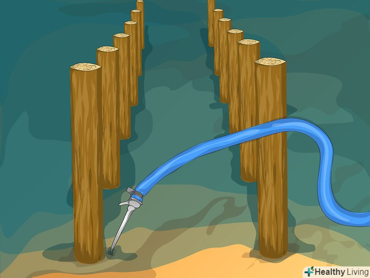 Орендуйте 2-3 дюймовий (5-8 см) бензиновий водяний насос, шланг для всмоктування або підйому, достатньої довжини, щоб брати воду з озера або моря для установки паль. також візьміть зливний шланг, достатньої довжини, щоб дістати до кінця пірсу від місця, де ви плануєте встановлювати насос. Альтернативою насоса може бути підключення пожежного гідранта, якщо ваша локальна ситуація дозволяє виконати цю дію, але в цьому випадку доведеться використовувати зворотний потік.