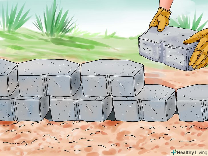 Почніть з закладки фундаменту. ці цеглини або кам'яні блоки будуть найважливішими у вашій стінці. Якщо вони не будуть викладені за рівнем або рівномірно підтримувати верхню половину вашої підпірної стінки, то вся конструкція буде виглядати ненадійно. Обов'язково простежте за тим, щоб блоки фундаменту були укладені за рівнем, міцними і щільно підігнаними.