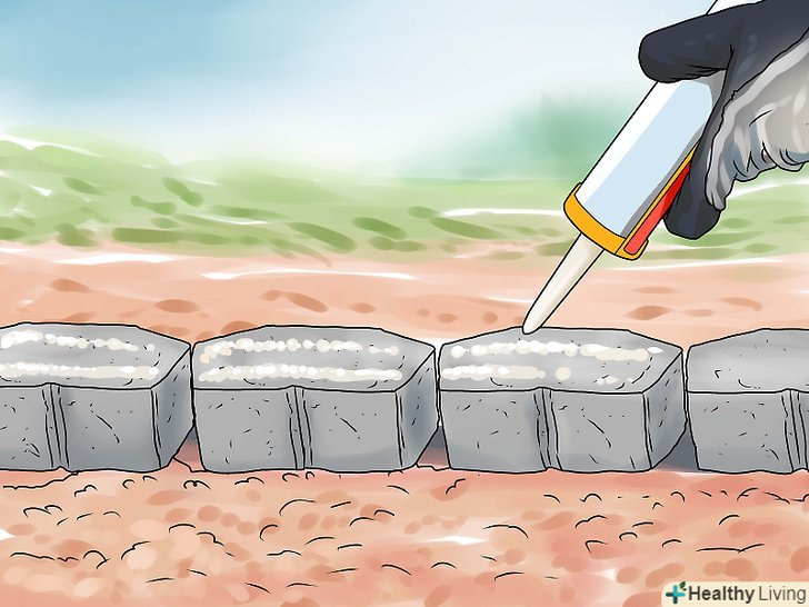 Почніть укладання другого шару в шаховому порядку, щоб шви верхнього шару не збігалися з нижнім. кожен шар кам'яних блоків повинен відрізнятися від попереднього. Наприклад, якщо по краях стінка має прямокутні грані, то наступний рівень слід починати з блоку, розрізаного навпіл.- Розташуйте блоки на фундаменті до укладання зчіпного розчину. Подивіться, як вони виглядають; подумайте, чи потрібно виконувати значну підрізування перед зчепленням. Обов'язково завершуйте один ряд, перш ніж перейти до наступного.