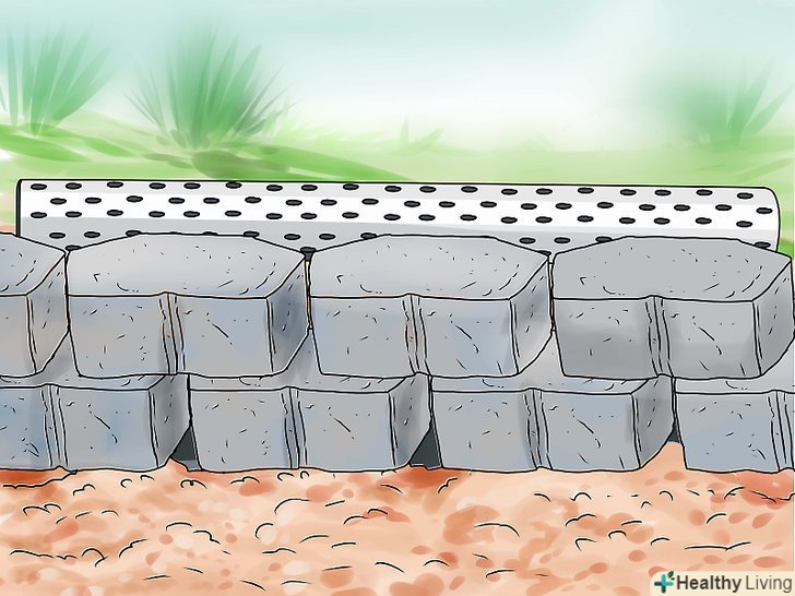 При висоті стінки 60 см і вище укладіть в неї дренажні труби. Візьміть перфоровану трубу і покладіть її з ухилом по довжині стінки, накривши її зверху повітропроникною зворотним засипанням.