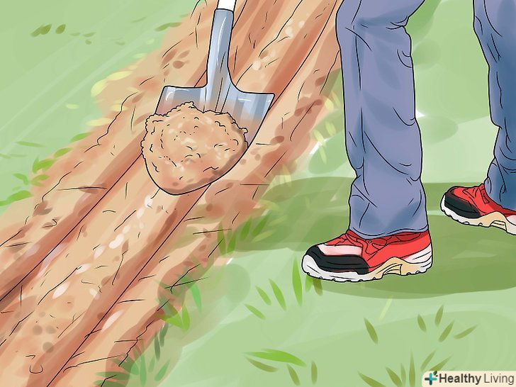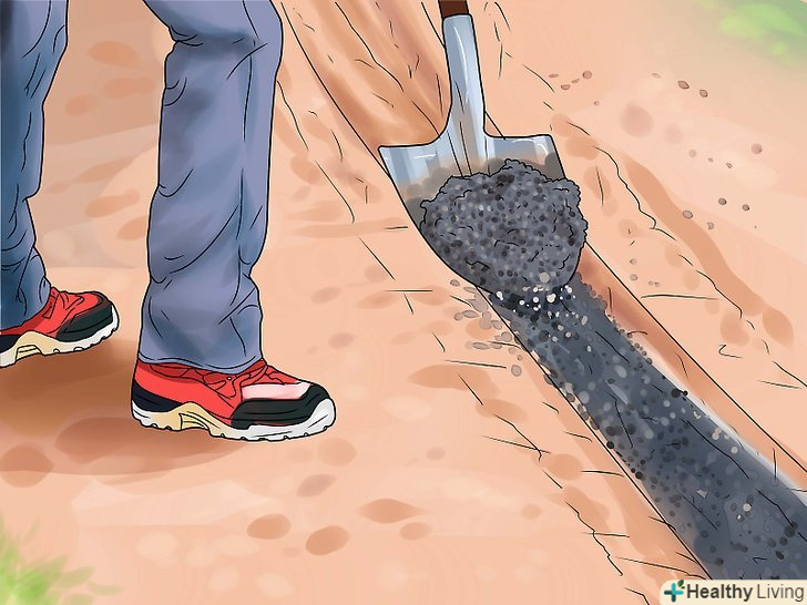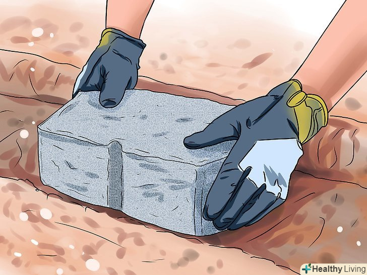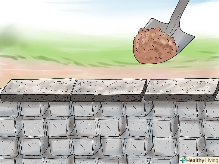 Земляні роботи. за допомогою лопати прокопайте траншею уздовж позначеної лінії. Вона повинна бути трохи ширше цегли або блоків, які будуть використовуватися для побудови. Дно траншеї має бути максимально рівним.- Траншея повинна бути такого розміру, щоб в неї вийшло вмістити нижній ряд цегли або блоків на глибину 2,5 см на кожні 20 см висоти стінки. Введіть в дану формулу рівень підстави фундаменту, яке буде укладатися на дно траншеї.