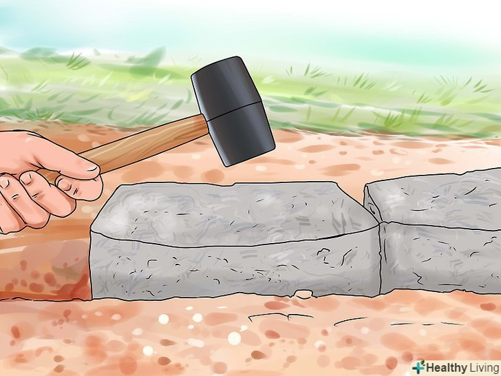 При необхідності в кам'яних блоках підстави можна вирізати з'єднання в шпунт. деякі підрядники перед укладанням вирізують в кам'яних блоках підстави виступи і пази. Самостійно перевіряйте міцність блоків і збивайте такі елементи за допомогою молотка і долота.- Слід розуміти, що виступи на кам'яних блоках не завжди підходять для фігурних підпірних стінок. Якщо вони не підходять під запланований контур стіни, то їх потрібно збивати за допомогою молотка і долота.