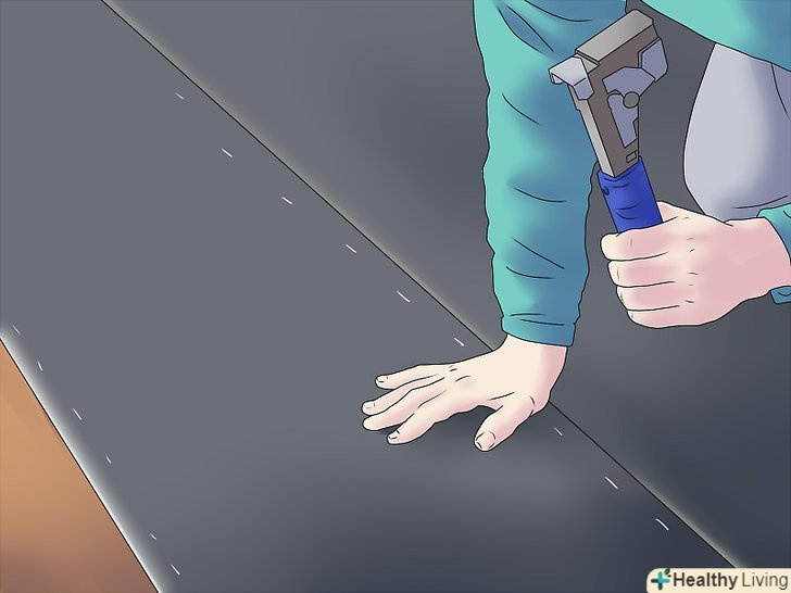 Почніть накладати руберойд. використовуйте цвяхи з капелюшком діаметром приблизно 2 дюйми (5 см), щоб цвяхи краще трималися, і матеріал не зірвало вітром.- За маркерами, зробленим зверху вниз на настилі даху, крейдою проведіть прямі лінії, це допоможе вам нанести руберойд рівно. Низ даху не варто використовувати в якості прямої лінії, так як це, швидше за все, призведе до того, що ви покладете його криво і на матеріалі залишаться складки. Внизу даху дозвольте повсті розшириться від 1/4 дюйма (6.5 мм) до 3/8 дюйма (1 см).
