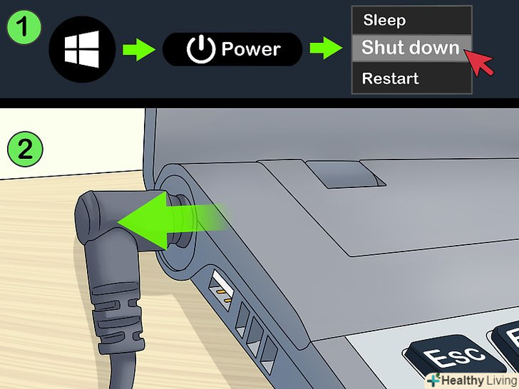 Вимкніть ноутбук.вимкніть ноутбук від електромережі, а потім натисніть і утримуйте кнопку живлення, щоб вимкнути ноутбук. Також можна скористатися налаштуваннями живлення ноутбука, щоб вимкнути його:- Windows: Натисніть "Пуск"gt; «Харчування»