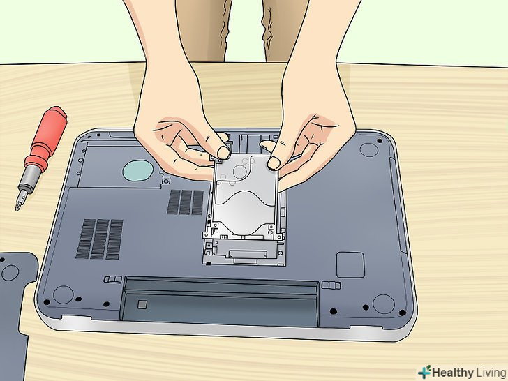 Вийміть жорсткий диск.для цього потягніть за спеціальну стрічку. Жорсткий диск підніметься, що дозволить вам витягнути його з ноутбука.- Можливо, вам доведеться від'єднати кабелі від жорсткого диска.