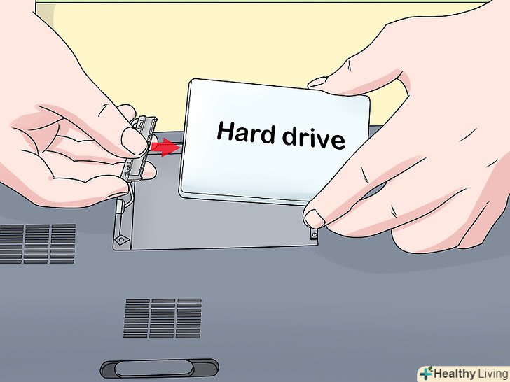 Вставте новий жорсткий диск.вставте його відповідною стороною у відсік, а потім злегка підштовхніть, щоб підключити до контактів. Не тисніть на жорсткий диск, щоб не пошкодити контакти.- Якщо потрібно, зафіксуйте жорсткий диск гвинтами.