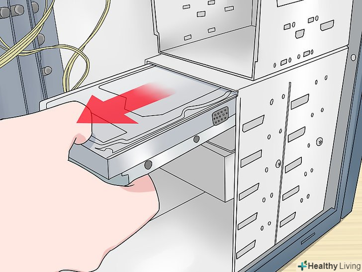 Вийміть старий диск .для цього від'єднайте від нього кабелі передачі даних і харчування, відкрутіть гвинти з обох сторін жорсткого диска, а потім витягніть його з корпусу.- Можливо, вам доведеться відключити кабелі від інших пристроїв і / або витягти якісь плати, щоб дістатися до жорсткого диска.