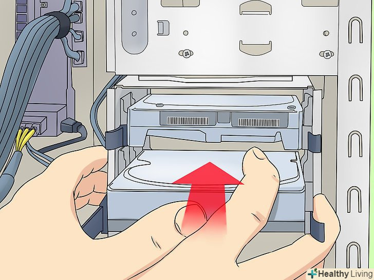 Встановіть новий диск.вийміть диск з упаковки і вставте його в спеціальний відсік в комп'ютерному корпусі. Отвори на бічних сторонах корпусу диска повинні збігатися з отворами на бічних панелях відсіку.- Якщо можливо, вставте диск в більший відсік-в цьому випадку диск буде краще охолоджуватися.