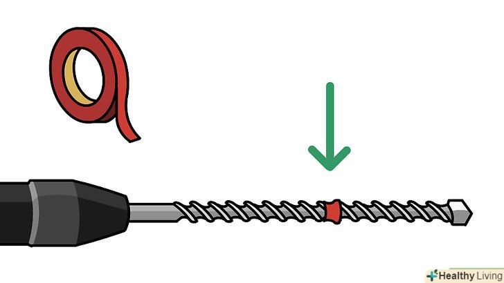 Налаштуйте глибину свердління. у деяких дрилів є можливість налаштування глибини свердління або спеціальний обмежувач. Прочитайте посібник користувача до інструменту, щоб дізнатися, як ним користуватися. Якщо ваш прилад не оснащений обмежувачем глибини свердління, відміряйте і відзначте олівцем або малярським скотчем необхідну глибину отвору на самому свердлі. Якщо ви не впевнені в тому, яка глибина отворів вам потрібна, дотримуйтесь вказаних нижче рекомендацій. [7]- Так як бетон є твердим і щільним матеріалом, то отворів глибиною в 2,5 см буде достатньо для закріплення в стіні шурупів на дюбелях для підвішування легких предметів. Більш важкі предмети зажадають застосування більш довгих шурупів з дюбелями або навіть анкерами, мінімальна глибина фіксації яких повинна бути вказана на упаковці.