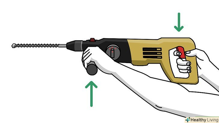 Правильно візьміть дриль в руки. Тримайте дриль однією рукою на зразок пістолета, поклавши вказівний палець на кнопку пуску. Якщо дриль оснащена додатковою рукояткою, візьміться за неї другою рукою і використовуйте для більш надійного захоплення інструменту. В іншому випадку просто підхопите дриль знизу другою рукою ближче до задньої частини корпусу.