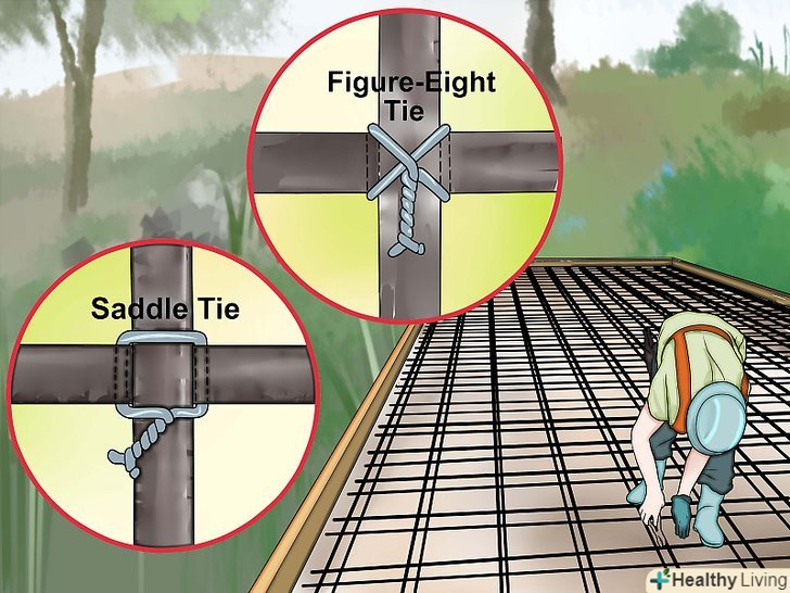 Виберіть тип вузла. для звичайних заготовок, коли тиск бетону на арматуру під час установки мінімально і зміщення поверхонь малоймовірно, досить простого щільного закручування дроту навколо місць перетину стрижнів. Цей вузол називається скрутка , його можна зав'язати за допомогою круглогубців і відрізка дроту з петлями по краях, про який говорилося раніше. Також це легко можна зробити за допомогою пари дев'ятидюймових плоскогубців і дроту з дротяної котушки. Для інших конструкцій, де тиск бетону може змістити арматуру, або необхідно більше сили, щоб утримати арматуру в потрібному положенні, потрібні більш складні вузли. Ось деякі з них зі спрощеним описом:- "вісімка". Оберніть дріт навколо заднього стрижня, перекиньте по діагоналі на лицьовій стрижень, оберніть його і поверніть назад до заднього. Далі закрутіть кінці дроту. Потім обріжте дріт від мотка і загніть гострі кінці до арматури. Цей вузол добре утримує перпендикулярні стрижні, не даючи їм зміщуватися по діагоналі.