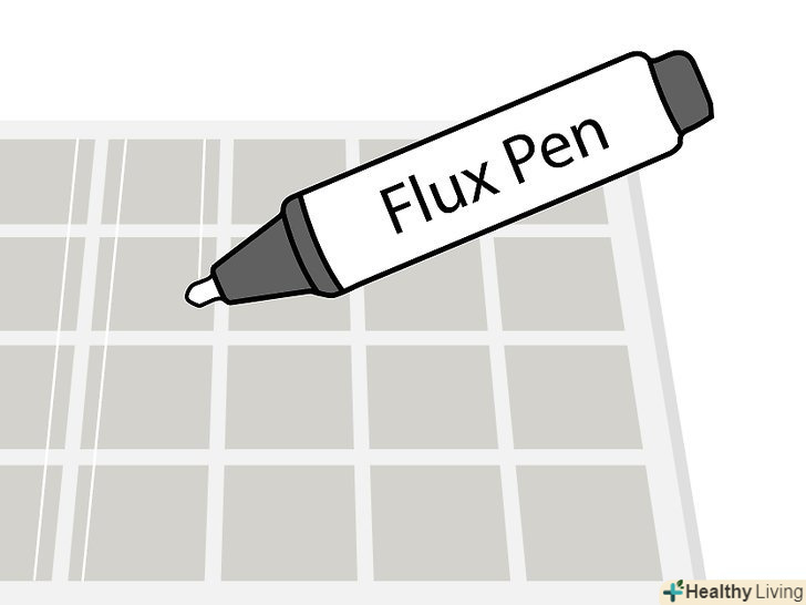 Спаяйте задні частини пластин. використовуйте паяльник на кожному з трьох квадратів на задній стороні пластини, потім, використовуючи Срібний припій, спаяйте разом першу половину смуги проводів і ці три квадрата.