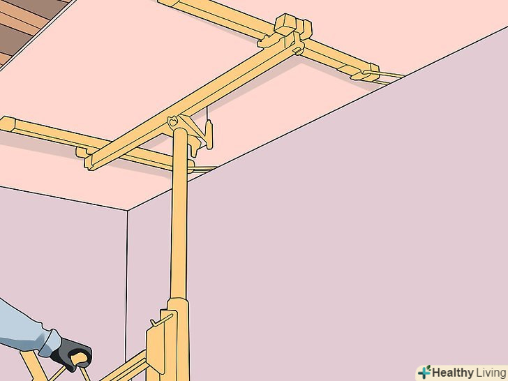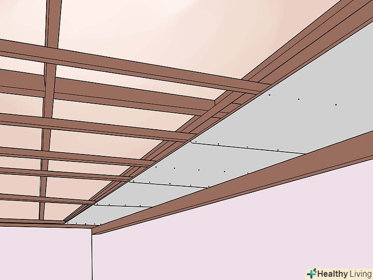 Підніміть лист гіпсокартону до стелі, починаючи кріпити з кута кімнати. Вам потрібно щоб краї були перпендикулярні крокв або поперечок і щільно прилягали до стіни.