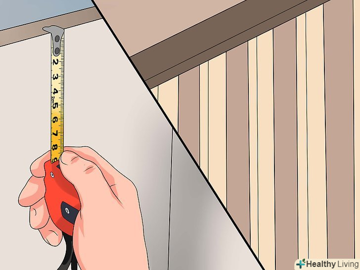 Виміряйте стіну шматком гіпсокартону, щоб визначити, чи буде його край лягати на центр стійки. знову ж таки, вам, ймовірно, доведеться вкоротити деякі шматки гіпсокартону для центрування краю на центрі стійки.- При нарізці гіпсокартону, для позначки лінії на його папері використовуйте т-косинець і гострий ніж. Розташуйте ваше коліно на протилежній стороні розрізу і різким рухом потягніть шматок гіпсокартону до себе, в той час як штовхаєте коліном від себе, переломлюючи гіпсокартон по лінії. Розріжте за допомогою ножа папір на утворився згині.