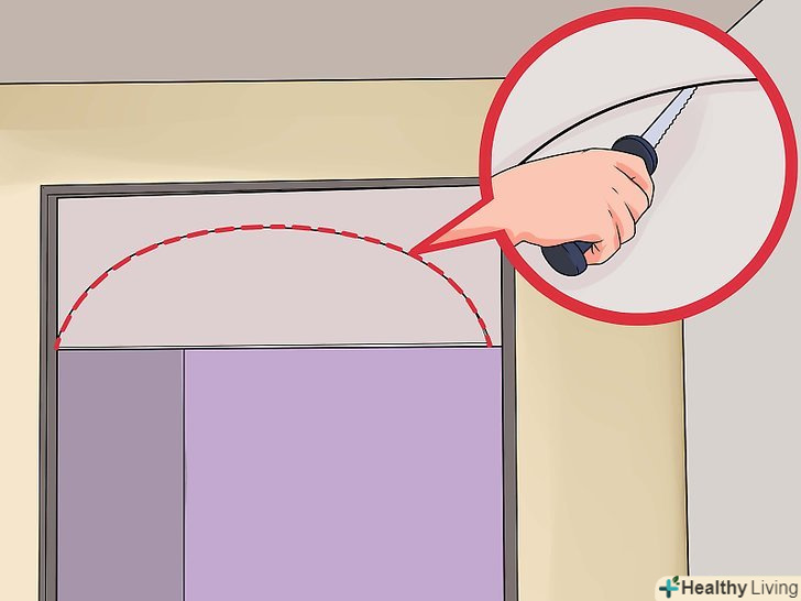Використовуйте пилку для гіпсокартону для вирізання нерівних отворів, таких як арки. продовжуйте кріплення гіпсокартону внахлест на віконні та дверні прорізи. Ви зможете відрізати зайву суху штукатурку пізніше. У той же час уважно дивіться, щоб шви не збіглися з кутом вікна або двері, і поки що не зашивайте панелі навколо вирізів.- Існує хороший спосіб установки гіпсокартону поверх виступаючих труб. Розмістіть гіпсокартон на трубі і злегка постукайте по ньому плоскою дошкою до утворення на зворотному боці невеликого поглиблення. Потім приберіть гіпсокартон в сторону і, використовуючи пилу або циркуль для сухої штукатурки, зробіть ідеальне отвір уздовж поглиблення. Це зробити набагато легше, ніж, якби ви вибивали велику дірку, яка вимагає для завершення 3-4 разового шпаклювання.