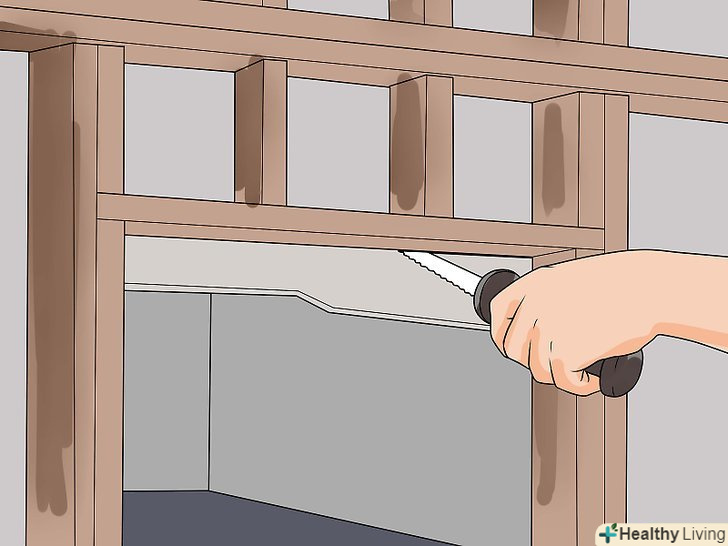 Відріжте всі частини гіпсокартону, що виступають поверх рам вікон і дверей. закріпіть гіпсокартон по периметру дверей і вікон і потім відріжте необхідні шматки за допомогою роторної дрилі або пили по гіпсокартону.