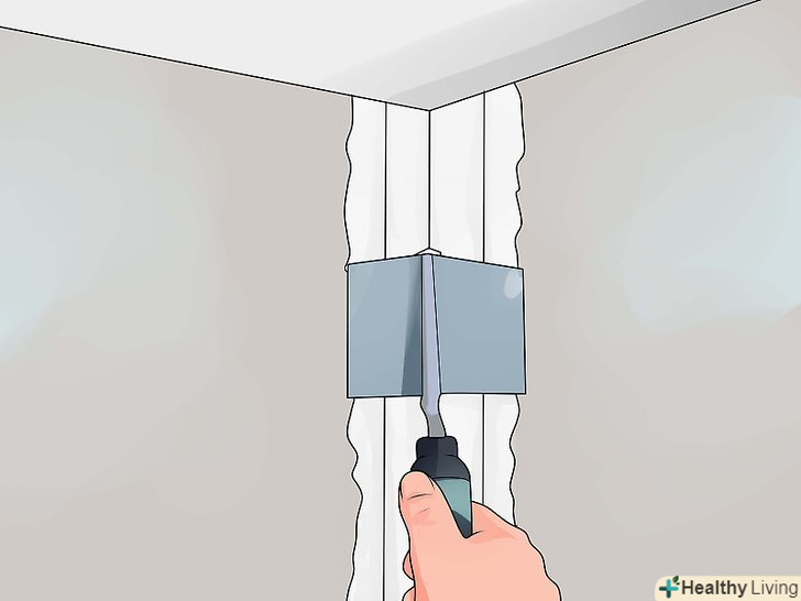 Для проклейки кутів використовуйте перфоуголок, який використовується як для зовнішніх, так і для внутрішніх кутів. це зробить вашу роботу по справжньому професійною.- Застосовуйте стрічку і шпаклівку таким же способом. Нанесіть необхідну кількість компаунда. Якщо це ще не зроблено, зігніть стрічку точно по центру і пару раз натисніть на утворену складку. Нанесіть стрічку таким чином, щоб її складка знаходилася точно по центру кута. За допомогою шпателя видаліть надлишки шпаклівки.