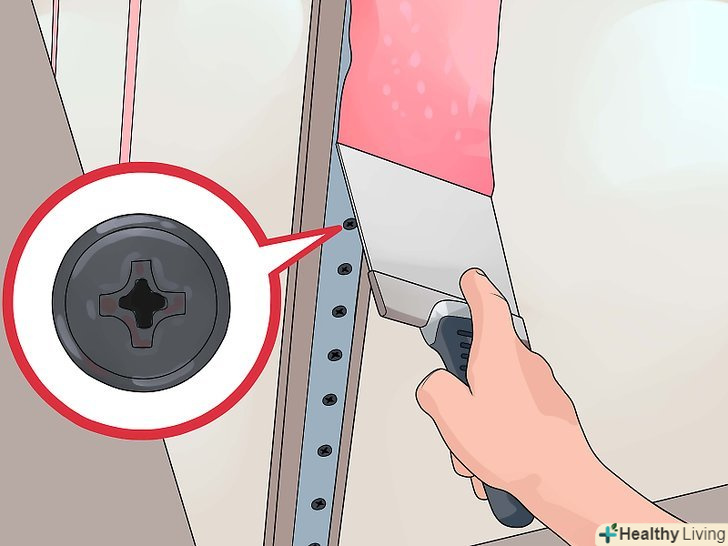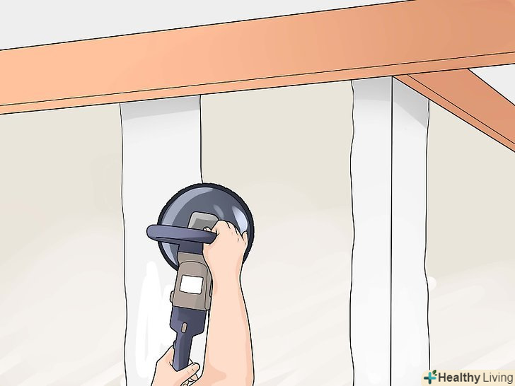 З чиєюсь допомогою підніміть гіпсокартон на стіну і, використовуючи дриль, вкрутіть п'ять шурупів в стійку по центру стіновий панелі. починайте в центрі і працюйте від нього. Вкрутіть по п'ять шурупів в кожну стійку.- Додаткові гвинти в деяких випадках можуть допомогти, але, як правило, це зайве; для них, можливо, буде потрібна додаткова шпаклівка і шліфування, що буде відволікати при фінішній обробці.