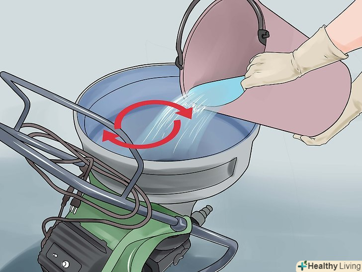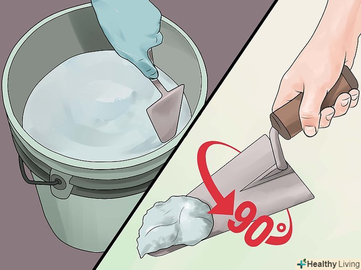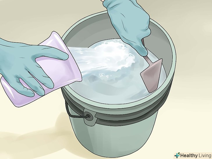 Засипка сухих компонентів і початок замішування. при використанні механічної мішалки її слід включити і потім потроху засипати сухі компоненти. Слідкуйте за тим, щоб не розсипати суміш і не розплескати воду, а також не переводити цемент через надмірне розпилення. Намагайтеся відводити обличчя в сторону, використовуйте засоби захисту органів дихання і не вдихайте осаджується пил.- При замішуванні вручну використовуйте невелику лопату або кельму, енергійно змішуйте розчин і додавайте потрібну кількість води. Ретельно вимішуйте для рівномірного розподілу продуктів.