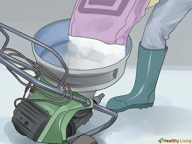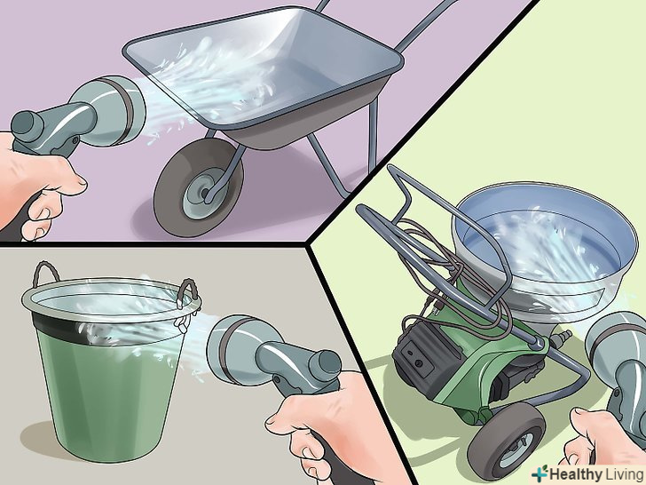 Змочуйте мішалку, візок і/або відра. перш ніж додавати сухі компоненти, необхідно змочити водою всі пристосування, в яких ви будете замішувати, переносити і працювати з розчином, щоб скоротити відходи і без проблем набирати розчин. Використовуйте близько половини води від кількості, необхідної для замісу, щоб змочити мішалку або корито, також налийте трохи води в візок або відра, в яких ви будете переносити розчин.- Залежно від величини будівельного проекту, можна використовувати невелике корито або бензинову растворомешалку для змішування великих обсягів. Така мішалка має кілька обертових лопатей і дозволяє завантажувати в неї до трьох мішків суміші по 40 кг кожен, полегшуючи важку задачу по замішуванню розчину. Можна взяти растворомешалку напрокат, особливо якщо ви плануєте працювати кілька днів.