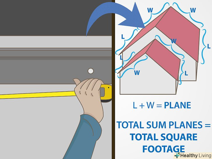 Підрахуйте площу даху в квадратних метрах. виміряйте довжину і ширину кожної ділянки даху, помножте довжину на ширину кожної площини, а потім складіть результати всіх площин для отримання загальної площі.