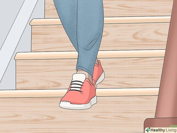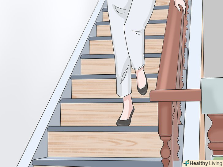 Ходіть по сходах у взутті. взуття з хорошою підошвою підвищить вашу стійкість при спуску вниз по сходах. Ходіння у взутті на високих підборах, шльопанцях з м'якою підошвою або шкарпетках, швидше за все, призведе до зісковзування вниз по сходах. [10]- Якщо у вас слабкі щиколотки, не забудьте про підтримку щиколотки, коли будете спускатися вниз по сходах. Підвернута кісточка може привести до падіння.