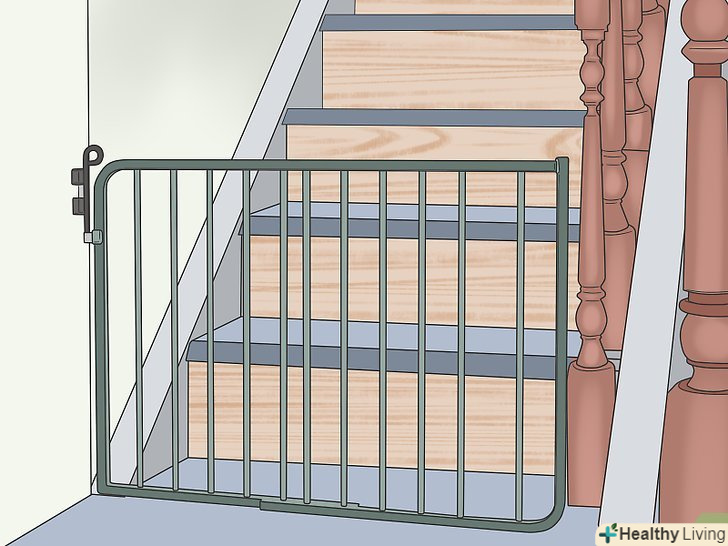 Не підпускайте до сходів людей, що знаходяться в групі ризику. Маленьких дітей і літніх людей, наприклад, страждають недоумством, які не можуть безпечно пересуватися по сходах, слід захистити від доступу до сходів, використовуючи для цього бар'єр. Переконайтеся, щоб сходи були перекриті як вгорі, так і внизу. [5]- Надійно прикріпіть бар'єр до бічної стіни. Інша сторона бар'єру буде кріпитися до сходової балясини.