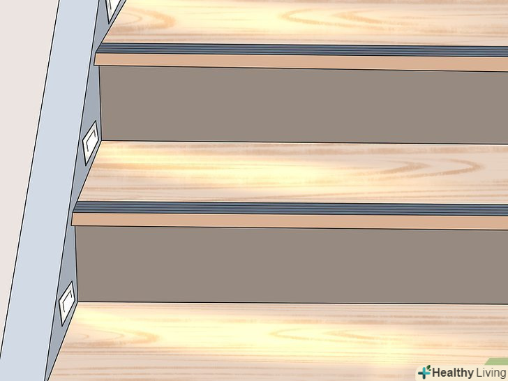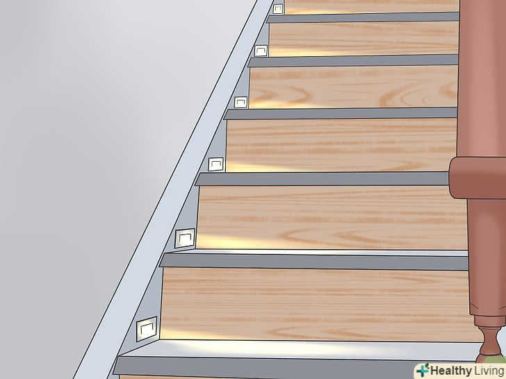 Обзаведіться необхідним освітленням. для безпечного спуску по сходах Рекомендується наявність хоча б 50 лк, тобто, мінімальна кількість світла, необхідного для читання. Переконайтеся, що освітлення завжди забезпечує хорошу видимість сходів. Бажано, щоб світло можна було включити як внизу, так і вгорі сходів. [8]- Сходове освітлення можна встановити в стіні, на висоті 12-15 см над сходами.