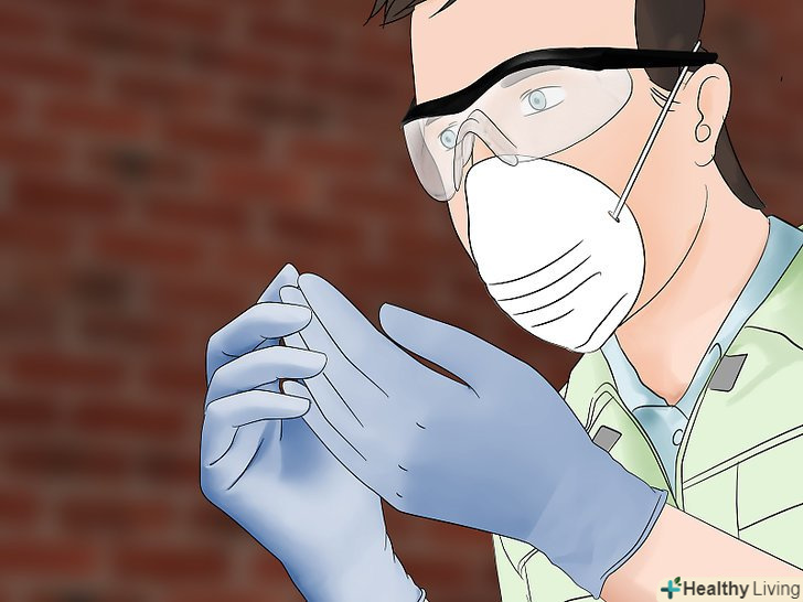 Одягніть Засоби індивідуального захисту. Контакт з цвіллю може викликати захворювання верхніх дихальних шляхів, а засоби для знищення цвілі також можуть мати шкідливий або руйнівний вплив на організм. Щоб захиститися під час прибирання, подумайте про засоби індивідуального захисту, включаючи наступне: [4]- Захисні окуляри;