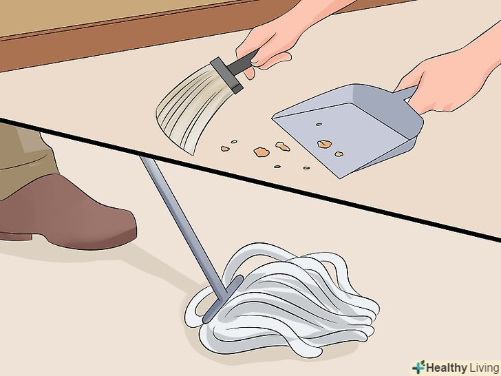 Часто підмітайте і мийте підлогу. якщо мурахи знайдуть лише кілька їстівних крихт, вони, швидше за все, повернуться, тому прибирайте всі залишки їжі, які могли впасти на підлогу або опинитися під кухонними приладами. [24] Підмітайте підлогу, щоб усунути привабливу мурах їжу, і мийте його розчином відбілювача з водою в пропорції 1:1.- Миючий розчин можна приготувати також з ½ оцту і ½ води. Головне, щоб він містив дезінфікуючий засіб, який знищить сліди мурах.