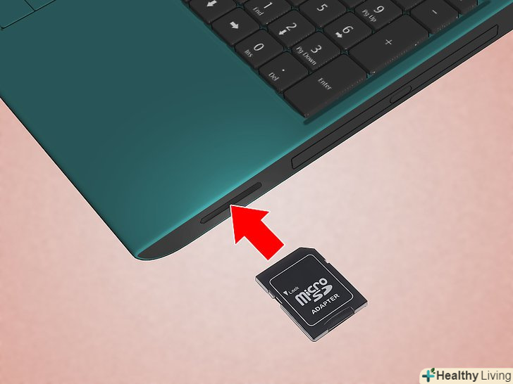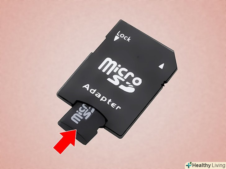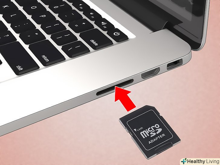 Вставте карту micro SD в спеціальний адаптер або кардрідер, сумісний з картами micro SD.наприклад, якщо у вас карта SanDisk micro SD, то вона поставляється зі спеціальним SD-адаптером. Адаптер має вигляд стандартної SD-карти з кишенею, в який вставляється карта micro SD.- Зверніть увагу, що карти micro SD об'ємом менше 32 ГБ форматуються у файловій системі FAT32, а карти об'ємом більше 64 ГБ – у файловій системі exFAT. Якщо ви форматуєте карту для використання в телефоні, Nintendo DS або 3ds, відформатуйте її в FAT32. Пам'ятайте, що зламані пристрої під управлінням Android не вміють працювати з файловою системою exFAT.