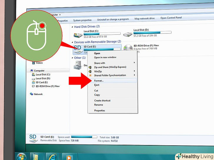 Клацніть правою кнопкою миші по кардрідеру (в списку підключених носіїв інформації) і виберіть «форматувати».відкриється вікно з параметрами форматування.- Якщо опція "форматувати" не відображається, вам, можливо, доведеться завантажити і встановити утиліту FAT32FORMAT GUI.