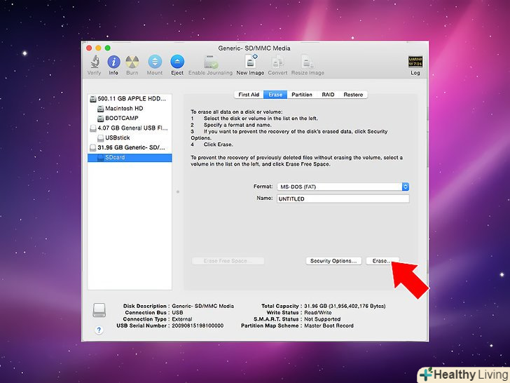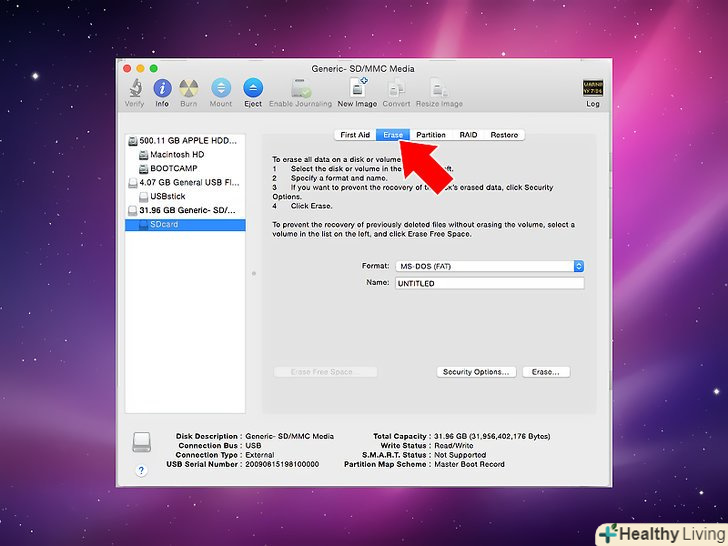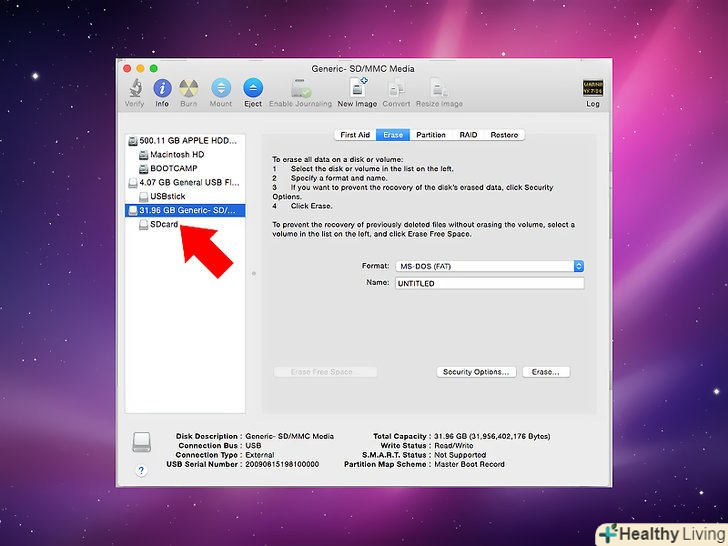 Клацніть по назві вашої карти micro SD в лівій панелі вікна "Дискова утиліта".у лівій панелі відображаються підключені жорсткі диски, їх розділи, а також зовнішні накопичувачі.- Ваша SD-карта буде відображатися в якості знімного диска; також буде представлена інформація про сумарну ємності карти.